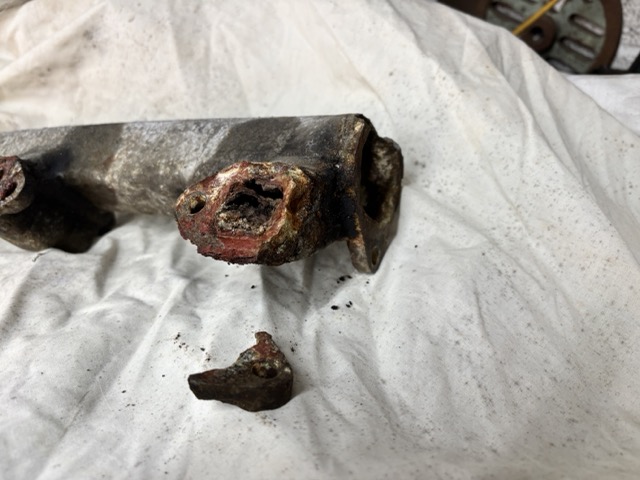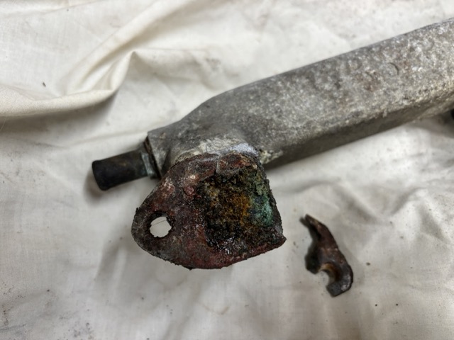First item to be removed is an alloy casting that ports hot water from the cylinder head to the radiator - a pretty important job. Sadly as mentioned in the previous post, it has a significant crack where it bolts to the thermostat housing. Upon removal and as you can see in the picture above - the casting has other issues in that 2 of the lugs where it bolts to the cylinder head were severley corroded and they just fell apart. INSIDE the casing, the water ways were gummed up with corroded alloy. I have seen this before - when alloy encounters extended periods of moisture in the air - it swells and crystallizes. It is removable but that will still leave the issue of the broken mounting lugs