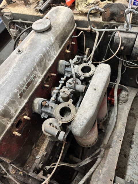 I chose to remove the entire carburettor/AED/linkiages and air filters as one unit but was disappointed to see that one of the carburetors is broken where the AED bolts on. I am guessing that something heavy landed on this area when the car was in storage but the damage could not be seen whilst they were in place. Luckily, the carburetor is replaceable and would have been rebuilt anyway but this is another item on the ‘Woe list’.
