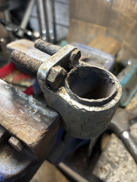 Sadly I didn't photograph the mounting with out the top elements. But I needed to remove the perished metalsatic bush so that I could remove the bolts you can see in the picture above. breaking apart an ancient rubber bush is relatively easy using a power drill and eating through the rubber until basically all of it is removed. The main bar can now be removed leaving part of the bush in the mount and the inside part of the bush on the bar. Next step is to remove that bush outer sleeve from the mounting. A saw cut down the length of the sleeve is a tried and trusted method of releasing the grip slightly so the remains can be 'persuaded' to come out. Next the more challenging part....