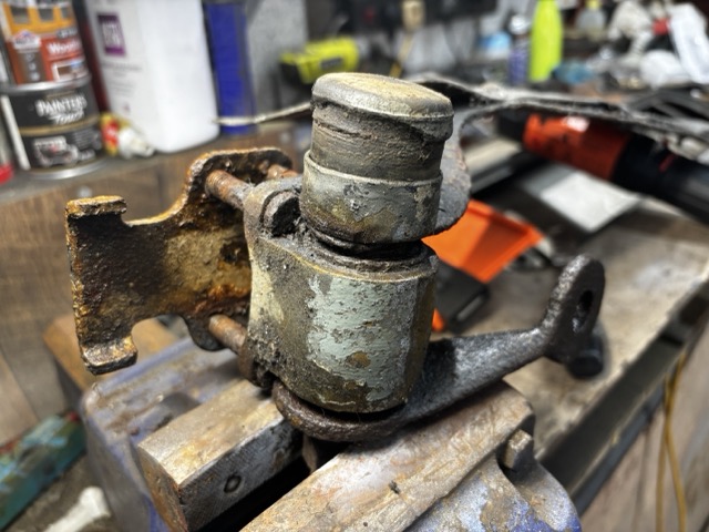 Above you can see the removed entire bumper mount. The top item is simply a rubber block pushed into a sleeve which apparently is there to further reduce vibrations but is easy to remove - below that is a nut that holds the whole mount together. As that nut is protected from the elements, it too was easy to remove. That is where 'easy' stopped. The rest of the mount is fused together with rust and despite soaking in rust remover for several weeks, nothing will budge.